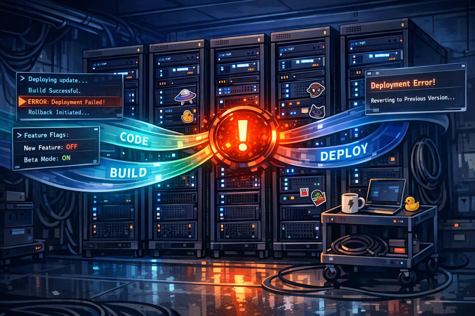 Feature flags are another game-changer. They let you separate deployment from release, meaning you can push updates to production without immediately making them visible to users. Tools like LaunchDarkly allow for gradual rollouts or provide an instant "kill-switch" to disable problematic features without redeploying. Pair this with automated rollbacks using methods like blue-green deployments or canary releases to minimize downtime when post-deployment health checks fail.